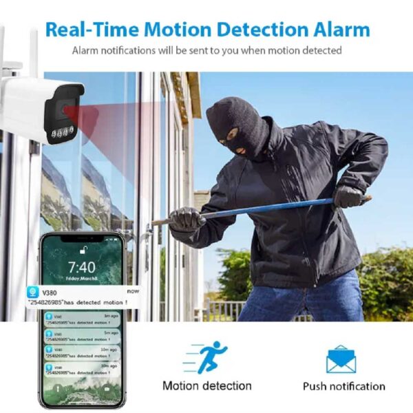 دوربین سیم کارتی بولت با طراحی کاربرپسند خود، به راحتی از طریق برنامه V380 Pro در تلفن هوشمند یا تبلت شما قابل دسترسی و کنترل از راه دور است. از هر کجای دنیا به امنیت ملک خود متصل بمانید و هر زمان که حرکتی تشخیص داده شد، هشدارهای بلادرنگ دریافت کنید.
